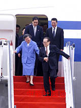 ![]() 何厚鏵陪江澤民與王冶坪下機(jī).國家主席江澤民與夫人王冶坪在澳門特區(qū)行政長官何厚鏵的陪同下,于19日下午乘專機(jī)抵達(dá)澳門機(jī)場,出席澳門回歸祖國一周年慶典活動(dòng),江澤民主要陪同人員錢其琛等同機(jī)抵達(dá)。中新社傳真 滿會(huì)喬攝 |