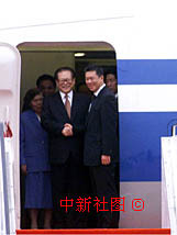 首次進(jìn)京述職的澳門特別行政長官何厚鏵陪同國家主席江澤民乘專機(jī)19日抵達(dá)澳門。中新社傳真 滿會喬攝