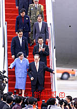 國家主席江澤民與夫人王冶坪在澳門特區(qū)行政長官何厚鏵的陪同下,于19日下午乘專機(jī)抵達(dá)澳門機(jī)場,出席澳門回歸祖國一周年慶典活動(dòng),江澤民主要陪同人員錢其琛等同機(jī)抵達(dá)。中新社傳真 滿會(huì)喬攝