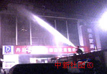 消防人員趕到河南洛陽發(fā)生重大火災(zāi)的商廈前,奮力噴水救人。中新社圖