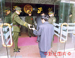 原江西省副省長胡長清一案十五日在南昌市公開宣判,審判庭約千余旁聽席坐無虛席。圖為南昌市中級人民法院的法警在第二道入場的關(guān)卡處驗票。中新社記者 段八一 攝