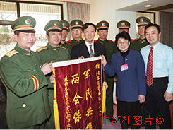 全國(guó)政協(xié)委員遲寶榮(右二)與負(fù)責(zé)接待出席會(huì)議部分政協(xié)委員的北京大觀園酒店副總經(jīng)理董利華十二日向武警北京總隊(duì)十三支隊(duì)官兵贈(zèng)送錦旗,感謝他們?yōu)楸Pl(wèi)“兩會(huì)”順利舉行做出的貢獻(xiàn)。作者:李剛