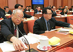全國(guó)人大香港代表吳康民(前左一)在十四日舉行的九屆全國(guó)人大三次會(huì)議主席團(tuán)第三次會(huì)議上按表決器。作者:李剛