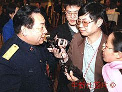 全國人大解放軍代表、海軍少將、湛江海軍基地政治委員傅渤海十五日在九屆全國人大三次會議閉幕會前,就海峽兩岸關(guān)系問題回答中外記者提問。作者:陳勇