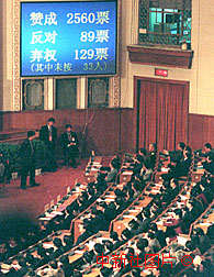 九屆全國(guó)人大三次會(huì)議十五日舉行閉幕會(huì),以二千五百六十票贊成、八十九票反對(duì)、一百二十九票棄權(quán)通過了中華人民共和國(guó)立法法草案。該法案從今年七月一日起施行。作者:王麗南