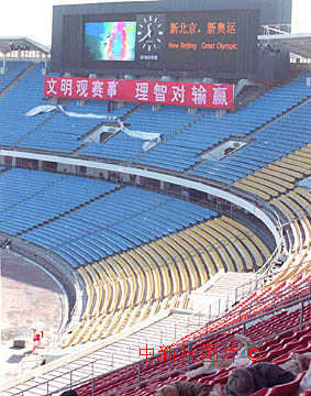 北京為申辦2008年奧運會而改建三個重要場館,其中工人體育場的新型電子顯示屏已經基本調試完畢。中新社記者 李剛 攝