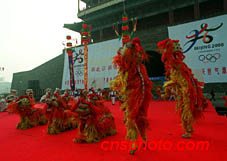 北京正陽門前舉行大型申奧文藝表演,古城樓下群獅起舞歡迎奧委會嘉賓。中新社圖 史利 攝