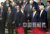 中國(guó)國(guó)家主席江澤民二十六日在海南博鰲水城集體會(huì)見出席亞洲論壇的貴賓,與亞洲論壇前政要們?cè)谝黄。中新社記?賈國(guó)榮 攝