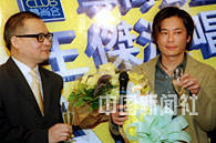 歌星王杰27日在香港出席「尊尚會呈獻(xiàn)王杰演唱會WANG'S 2001」記者會,會上英皇娛樂行政總裁李進(jìn)與歌星王杰祝酒。中新社傳真 鄧慶樂 攝