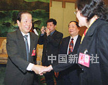 國務院副總理錢其琛八日在北京人民大會堂臺灣廳,向出席全國政協(xié)大會的臺灣婦女代表祝賀節(jié)日。中新社記者 宋吉河 攝