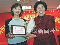 大陸正在走紅的女演員徐靜蕾,因其良好的社會聲譽和健康的形象,八日被全國婦聯(lián)授予“健康大使”。圖為全國婦聯(lián)副主席沈淑濟(右)向徐靜蕾授“健康大使”牌。中新社記者 王麗南 攝