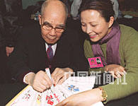 全國(guó)政協(xié)委員、著名京劇表演藝術(shù)家袁世海,在北京參會(huì)中為青年委員李羚題寫(xiě)折扇。中新社記者 錢(qián)興強(qiáng) 攝