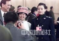 九屆全國人大四次會議第五次全體會議十五日上午在北京人民大會堂舉行,出席會議的少數(shù)民族代表與著名歌唱演員宋祖英合影。中新社記者 毛建軍 攝