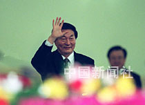 國(guó)務(wù)院總理朱镕基十五日走向北京人民大會(huì)堂,高興地向中外記者招手致意。中新社記者 毛建軍 攝