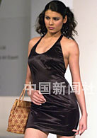 參加“2001亞太區(qū)皮革春季展”的印度模特,27日向客商展示印度生產的女式皮包。中新社傳真 任晨鳴 攝