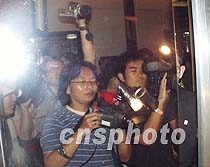 美國(guó)駐華使館原定四月三日晚十時(shí)在?谖娜A大酒店舉行記者招待會(huì),延至四日凌晨一時(shí)四十分宣布取消。圖為美國(guó)駐華大使館武官及使領(lǐng)館人員在文華大酒店電梯口出現(xiàn)時(shí),被現(xiàn)場(chǎng)中外記者追訪。中新社記者 莫成雄 攝