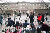 美駐華使館門(mén)前記者安營(yíng)扎寨 2001年4月6日 16:02 ![]()