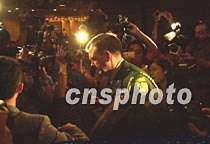 美國駐華使領館官員席樂高八日凌晨二時許在?谖娜A酒店出席海南省外事僑務辦公室舉行的新聞發(fā)布會后,面對中外記者包圍追問與機組人員第三次見面等情況,再也一言不發(fā)。中新社記者 賈國榮 攝