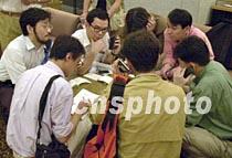 一批日本記者連日在海南省?谖娜A大酒店整天追蹤采訪美國(guó)軍用偵察機(jī)撞毀中國(guó)戰(zhàn)機(jī)事件,獲得報(bào)道信息后往往圍在圓桌邊共同分享。中新社記者 賈國(guó)榮 攝