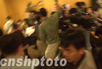 云集海口的一百多名中外記者,十一日晚七時(shí)許采訪海南省政府外事辦公室在?谖娜A大酒店舉行的新聞發(fā)布會(huì)后,立刻爆發(fā)新聞大戰(zhàn),眾記者奮力爭(zhēng)奪中國(guó)外長(zhǎng)唐家璇接受美國(guó)政府致歉信的文稿,然后各自飛奔去發(fā)稿。中新社記者 賈國(guó)榮 攝