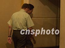 美國(guó)駐華使館武官席樂(lè)高準(zhǔn)將十一日晚十時(shí)四十分在?谖娜A大酒店新聞發(fā)布會(huì)上說(shuō),現(xiàn)在還不能公布一個(gè)機(jī)組人員離境的時(shí)間表,然后匆匆忙忙從后門(mén)離開(kāi)。中新社記者 賈國(guó)榮 攝