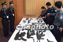 廣東省嚴(yán)打整治斗爭(zhēng)戰(zhàn)果顯著,四月以來(lái),全省共破各類刑事案件五千八百起,抓獲犯罪嫌疑人六千多名,繳獲槍枝一百多支。圖為警方展示近日繳獲的槍械。中新社圖 梁永強(qiáng) 攝