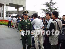 十八日下午在北京外交部門前等待中美撞機(jī)事件談判消息的中外記者聚集在一起。中新社圖 宋吉河 攝