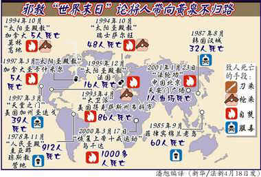圖表:邪教“世界末日”論帶人走向黃泉不歸路 2001年4月19日 11:15 ![]() 相關報道:邪教與“世界末日” 相關報道:秘魯一家七口相信世界末日說服毒自殺 相關報道:法新社介紹具有破壞性或相信世界末日的幾個邪教派 |