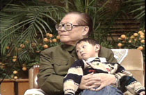 中國國家主席、中央軍委主席江澤民二十日在北京人民大會堂抱著王偉的兒子,會見被美機撞毀犧牲的飛行員王偉的家屬。