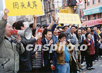 紐約華人社團聯(lián)合會等僑團二十一日在華埠鬧市的六個地段向行人講解“法輪功”的危害。聯(lián)合總會主席梁冠軍(左四)用麥克風向“法輪功”信徒呼吁珍惜自己和家人的生命,不要再受李宏志的蒙騙。中新社圖 郭健 攝