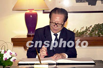 國家主席江澤民五月九日出席香港特區(qū)行政長官舉辦的午宴并在留言簿上簽名。中新社傳真 任海霞 攝