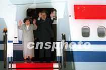 國家主席江澤民9日結(jié)束訪問香港,江澤民主席與夫人王冶坪向送行人士揮手道別。中新社傳真 盧峰 攝