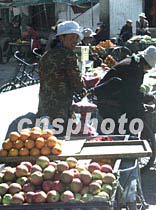 西藏拉薩五月的街頭,小販在叫賣著新鮮的水果。如今藏族人的生活水平日漸提高,購買空運的時鮮蔬果已經不再是困難的事情。中新社記者 滿會喬 攝