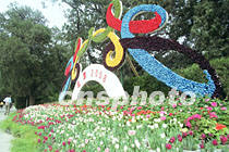 在北京古老的皇家園林蒼松翠柏前,一座用歐洲名花郁金香搭制的申辦奧運會圖案,亦美亦香。中新社記者 賈國榮 攝