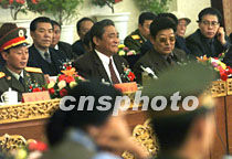 熱地說,統(tǒng)一與分裂是西藏最大的政治分野 2001年5月24日 07:25 ![]() 中國紀(jì)念西藏和平解放五十周年座談會五月二十三日在拉薩舉行,全國人大常委會副委員長帕巴拉·格列朗杰(右二)、西藏自治區(qū)人大主任熱地(右三)等出席座談會。中新社記者 滿會喬 攝