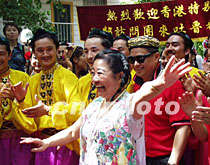 五月末在新疆吐魯番考察的香港代表團(tuán)被新疆民族歌舞吸引,華懋集團(tuán)主席龔如心裝扮獨具一格跳起舞來。中新社圖 陳國華 攝