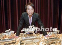 歌星李克勤1日在香港出席「2000/01年度香港賽馬會(huì)冠軍人馬獎(jiǎng)」記者會(huì),與多個(gè)精致馬匹獎(jiǎng)座合照。中新社傳真鄧慶樂攝