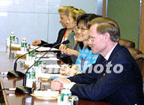 石廣生會(huì)見美貿(mào)易代表 雙方還將進(jìn)一步商議 2001年6月5日 15:44 ![]() 石廣生與美國貿(mào)易談判代表羅伯特·佐立克一行會(huì)晤。中新社記者 潘索菲 攝 ![]() 二○○一年APEC貿(mào)易部長(zhǎng)會(huì)議將于六月六日開幕。會(huì)議主席、中國外經(jīng)貿(mào)部部長(zhǎng)石廣生和中國代表團(tuán)團(tuán)長(zhǎng)、外經(jīng)貿(mào)部首席談判代表龍永圖,五日在上海國際會(huì)議中心與經(jīng)濟(jì)體代表團(tuán)團(tuán)長(zhǎng)舉行雙邊會(huì)談。圖為美國貿(mào)易談判代表羅伯特·佐立克。中新社記者 潘索菲 攝