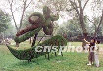 天津人民公園內(nèi)六月設(shè)立“迎奧運(yùn)”的草雕景點(diǎn),用八萬多棵青草組成,表達(dá)了天津人民支持北京申奧的熱切心情。中新社圖 姬培棟 攝