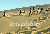 中新網(wǎng)敦煌6月12日消息:(記者呂振亞)西出嘉峪關(guān),“北京——莫斯科申奧萬里行”鳳凰車隊(duì)今天中午在敦煌安營扎寨。 北京時(shí)間下午七時(shí),敦煌上空的太陽依然“高高在上”,車隊(duì)同仁頭頂烈日,驅(qū)車來到鳴沙山下月牙泉邊。 鳳凰衛(wèi)視主持人曾靜漪一聲“令”下,全體將士齊聲應(yīng)答:“挑戰(zhàn)極限,喲!”一時(shí),將士們朝沙山上沖去,身后留下深深的足跡。大家開心地歡呼,隨隊(duì)的北京電信衛(wèi)星通訊車的小伙子還在沙坡上踩出了“五環(huán)旗”,隨行記者把這一精彩瞬間永恒珍藏,并將隨著我們一路遠(yuǎn)征莫斯科。(完) |