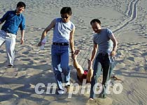 圖文:申奧“萬里行”將士挑戰(zhàn)敦煌鳴沙山極限 2001年6月13日 09:38 ![]() “萬里行”鳳凰車隊(duì)在敦煌鳴沙山挑戰(zhàn)極限。圖為將士們登頂后從沙山上順坡而下,齊聲呼喊。魏孝明 攝 ![]() 鳳凰衛(wèi)視編導(dǎo)李哲小姐雖發(fā)揚(yáng)“不怕苦不怕累”的精神,但終因體力不支,在沙坡上累倒了。圖為隊(duì)友把她從坡上“拖”下來的情景。魏孝明 攝