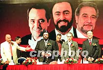 圖:三大男高音演唱會(huì)新聞發(fā)布會(huì) 2001年06月21日 18:46 ![]() 世界三大男高音北京紫禁城演唱會(huì)新聞發(fā)布會(huì)21日在北京舉行,先期到達(dá)北京的帕瓦羅蒂、卡雷拉斯和三大男高音的經(jīng)濟(jì)人魯?shù)浪沟瘸鱿⒒卮鹆酥型庥浾叩奶釂。中新社記?李剛 攝
