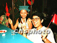![]() 北京時(shí)間十三日晚二十二時(shí)許,福州一對(duì)情侶在酒吧獲悉北京成功取得2008年奧運(yùn)會(huì)申辦權(quán)后欣喜若狂。中新社圖 劉可耕 攝
