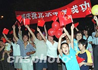 組圖:各地歡慶申奧成功 2001年07月14日 07:00 ![]() 13日晚,北京市民得知申奧成功后,紛紛走上長安街,舉行盛大的慶祝活動。中新社記者 趙振清 攝 ![]() 13日夜,深圳市民為北京申奧成功而歡呼。中新社記者 陳文 攝
