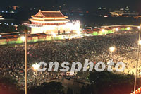 圖:天安門廣場(chǎng)人潮涌動(dòng) 2001年07月14日 07:11 ![]() 北京天安門廣場(chǎng)十三日夜人潮涌動(dòng),數(shù)以十萬(wàn)計(jì)的民眾徹夜不眠慶祝北京申奧成功。中新社記者 毛建軍 攝