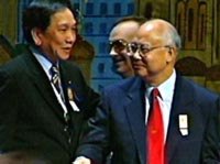 圖:何振梁接受國際友人的祝賀 2001年07月14日 07:28 ![]() 13日晚,北京申奧成功后,國際奧委會委員們向奧委會執(zhí)委何振梁表示祝賀。