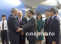 ![]() 美國(guó)國(guó)務(wù)卿鮑威爾二十八日八時(shí)十五分抵達(dá)北京國(guó)際機(jī)場(chǎng),開始對(duì)中國(guó)的訪問(wèn)。中新社記者 滿會(huì)喬 攝 ![]() 美國(guó)國(guó)務(wù)卿鮑威爾二十八日上午八時(shí)十五分抵達(dá)北京國(guó)際機(jī)場(chǎng),開始對(duì)中國(guó)的訪問(wèn)。中國(guó)駐美大使楊潔篪和美國(guó)駐華大使雷德等前往機(jī)場(chǎng)迎接。中新社記者 滿會(huì)喬 攝
