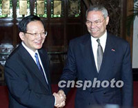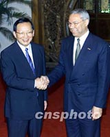 中美外長(zhǎng)會(huì)談 鮑威爾重申堅(jiān)持一個(gè)中國(guó)政策 2001年07月28日 17:21 ![]() 中國(guó)外交部長(zhǎng)唐家璇二十八日在北京釣魚(yú)臺(tái)國(guó)賓館會(huì)見(jiàn)美國(guó)國(guó)務(wù)卿鮑威爾。中新社記者 滿(mǎn)會(huì)喬 攝 ![]() 中國(guó)外交部長(zhǎng)唐家璇與美國(guó)國(guó)務(wù)卿鮑威爾二十八日在北京釣魚(yú)臺(tái)國(guó)賓館舉行會(huì)談。中新社記者 毛建軍 攝