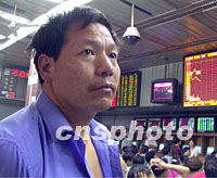 中國深滬股市周一的大幅下跌使北京證券市場的股民頗為吃驚。當日深證成份指數(shù)以跌223.995點(-5.16%)報收,上證指數(shù)以跌108.91點(-5.27%)報收。七月以來,中國股民對國有股減持價格過高表示了一定的擔憂。中新社記者 鄒憲 攝