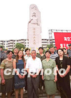 圖文:“?招l(wèi)士”王偉的塑像在浙江湖州落成 2001年08月02日 06:19 ![]() 中國“海空衛(wèi)士”王偉塑像落成典禮八月一日在浙江省湖州市鳳凰公園廣場舉行,由花崗巖制作的王偉塑像高10米、寬2.2米、厚2.3米、重約80噸,采用的是南京藝術(shù)學(xué)院青年教師、著名雕塑家李廣玉構(gòu)思的設(shè)計方案。中新社圖 張全躍 攝 ![]() 中國“?招l(wèi)士”王偉塑像落成典禮八月一日在浙江省湖州市鳳凰公園廣場舉行,王偉父母王明、王月琴(中)、妻子阮國琴(右)、姐姐(右四)等親屬與近千名各界群眾和當(dāng)?shù)伛v軍官兵參加了儀式并合影留念。中新社圖 張全躍 攝